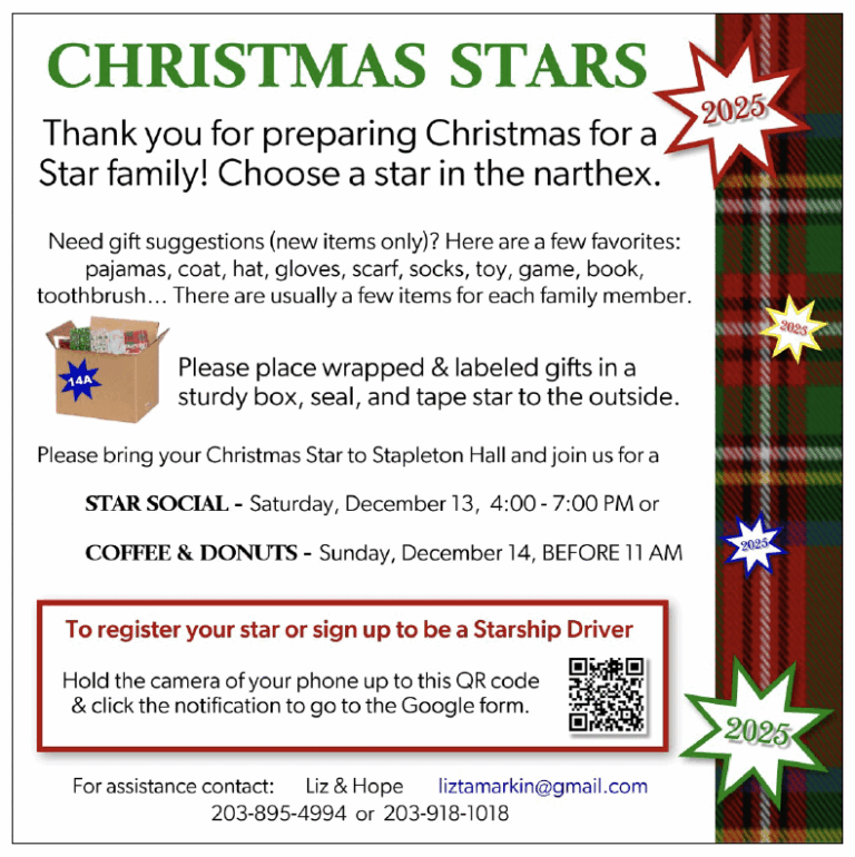 Thank you for preparing Christmas for a Star family! Choose a star in the narthex.