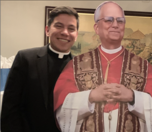 Herley has already gotten involved in parish life and is spending time with staff to learn more about pastoral leadership. He has a truly joyful and generous spirit and is eager to meet you! He is pictured below at our staff end-of-the-pastoral-year dinner with our special “guest.” Please join me in welcoming Herley.